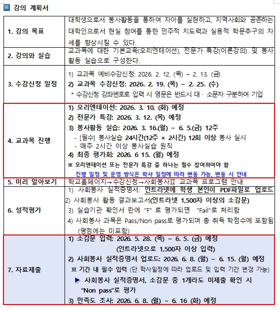 2026학년도 1학기 사회봉사I 프로그램운영 계획