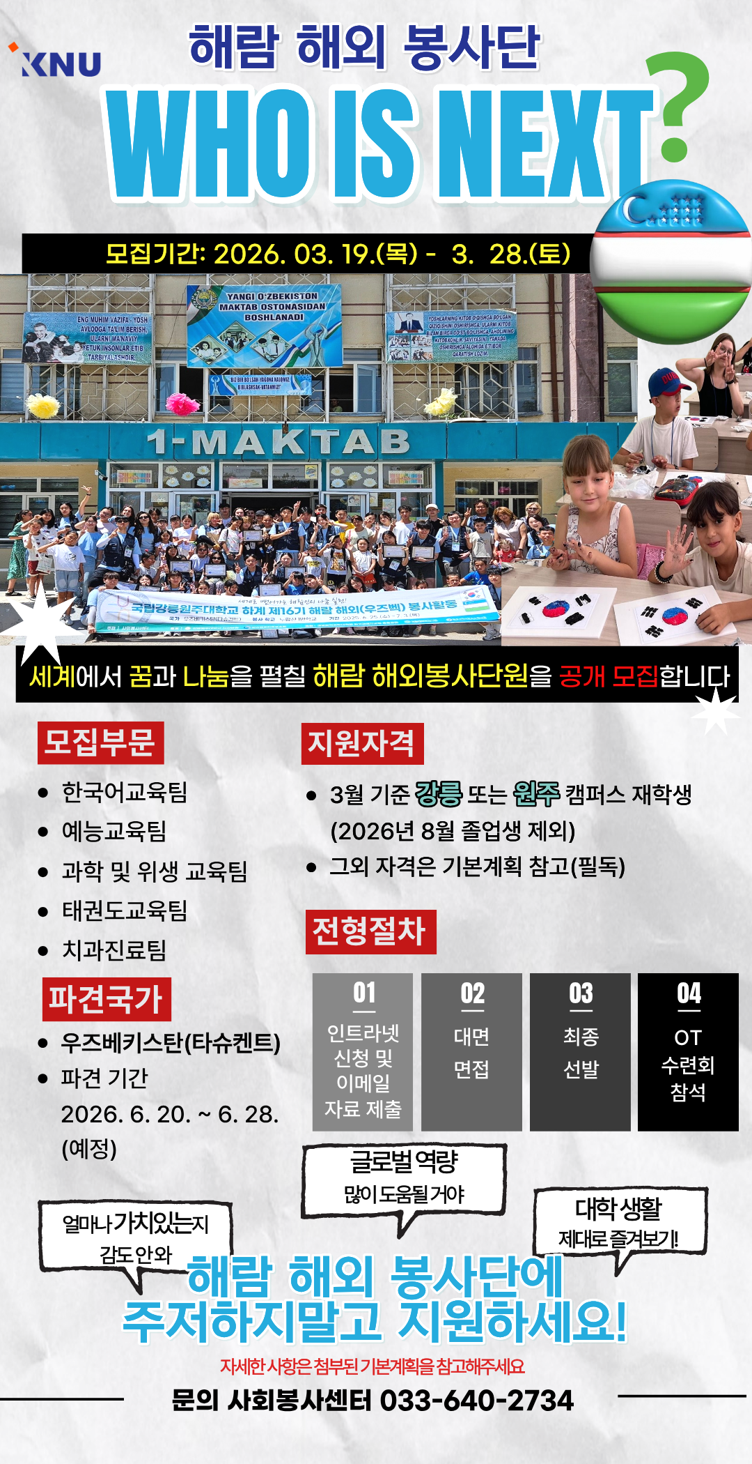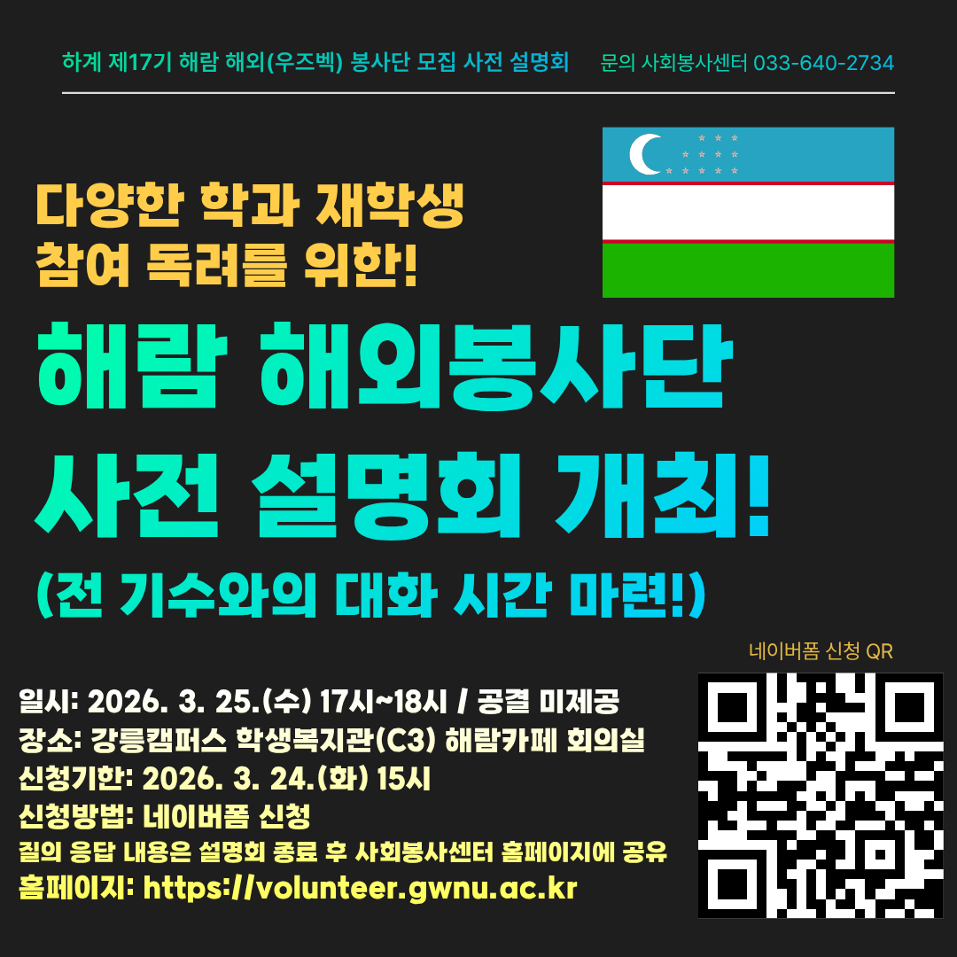 2026학년도 강원대학교 하계 제17기 해람 해외(우즈베키스탄) 봉사단을 모집합니다.